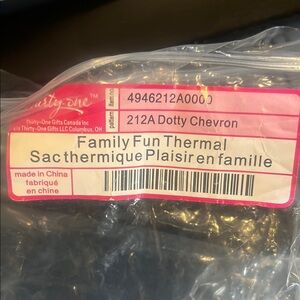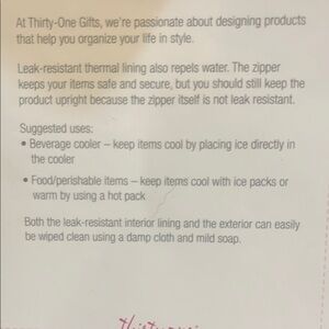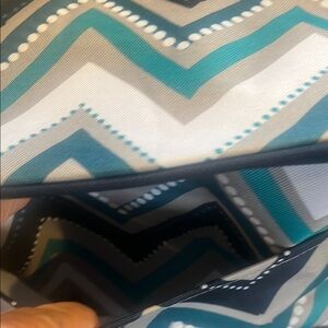 Chevron pattern cooler bag with teal, black, and white colors. Ideal for keeping items chilled. leak resistant thermal lining also repels water. The zipper keeps the item safe and secure, but you should still keep the products upright because the zipper itself is not leak resistant. This is a great beverage cooler. Also great for keeping things cool or warm with cold packs or hot packs great for taking a casserole to a potluck