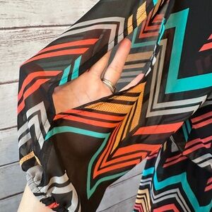 This vibrant size 14W dress features a playful Chevron print and long sheer sleeves with stylish slits. Perfect for making a statement at any occasion!