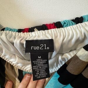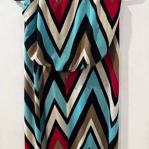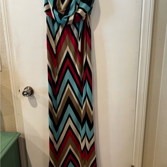 Stylish maxi dress with a vibrant chevron pattern. Features red, blue, brown, and black colors.