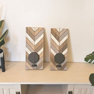 Set of two chevron pattern wooden wall sconces in like new condition. Perfect for holding candles. Features natural wood tones with cream accents.