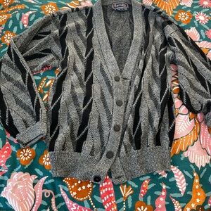 Chic cardigan with a chevron design in gray and black. Features button closure and long sleeves.