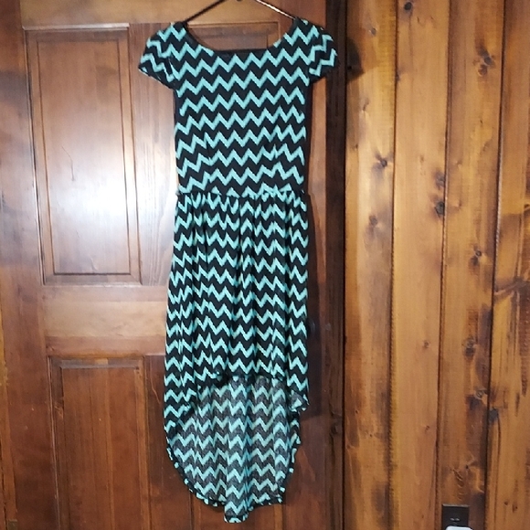 Stylish high-low dress featuring a bold chevron pattern. Perfect for any occasion.
