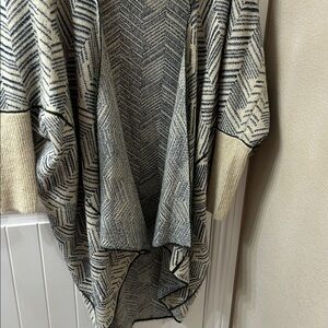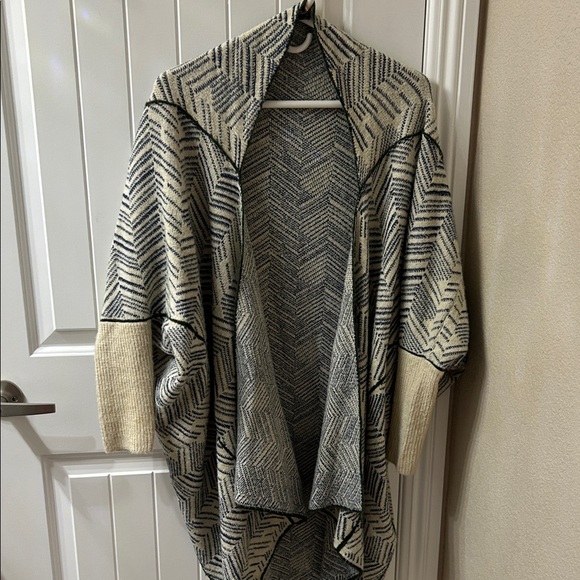 Stay cozy and stylish with this chevron patterned open front sweater. Featuring a blend of cream and black colors, this sweater is perfect for layering.