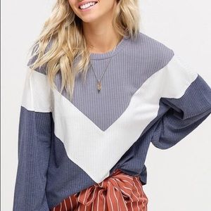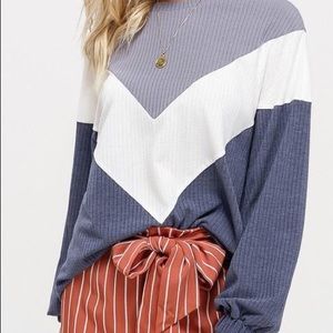 Chevron tops are running the trends this winter and spring and this one will not disappoint! Roomy, dolman style fit in a soft ribbed knit. Round scoopneck on this adorable top, makes it extra cozy.
