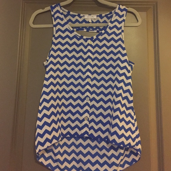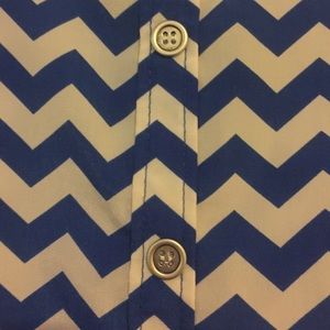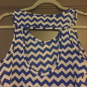 Blue and white chevron top with a cute cutout on the upper back (I know it's kinda hard to tell in the pics because of the busy pattern). It also has a cute button detail on the front however it doesn't unbutton, they are just part of the design