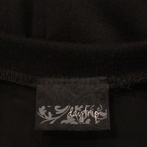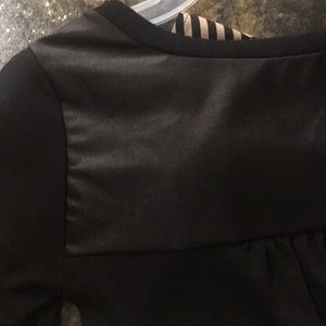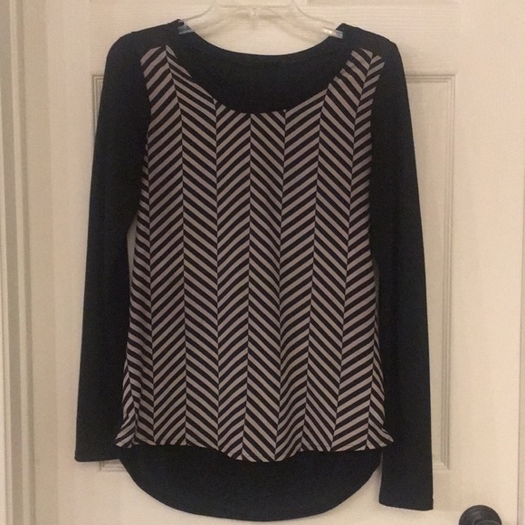 Gently worn chevron tan/black tunic, shirt material in front and back yoke has a faux leather look and back of shirt has a light sweater feel, Size Small, hem slightly longer in back but not drastic
