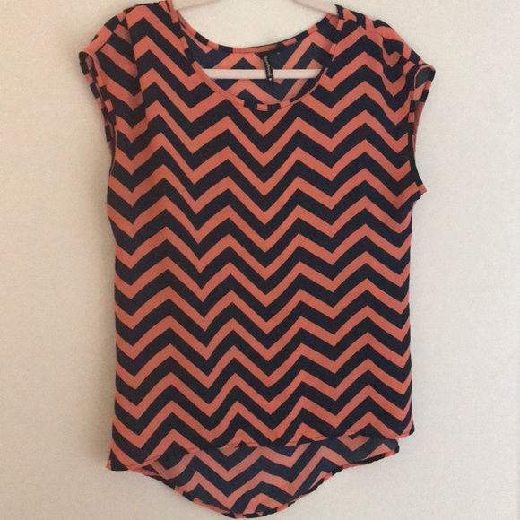 Blue and orange chevron pattern blouse. Longer in back than front. Worn a couple times. Smoke free home. Fast shipping. Bundle with other items to save more.