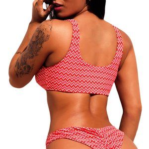 This chevron striped two piece swimsuit is made of premium fabric. Tie in front. Molded removable cups. Rouching in back.