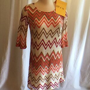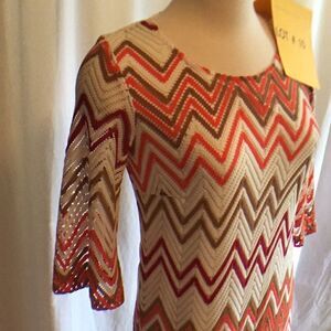 Knit weave in a chevron pattern in size medium petite. NWOT. Body is fully lined, sleeves are open weave. Measurements are as follows: bust 36”, waist 34”, hips 36”, dress length 32”, sleeve length 14”.