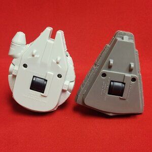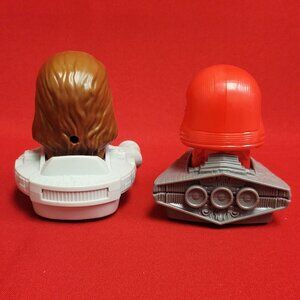 Left Toy (Chewbacca): This toy features a Chewbacca head atop a miniature Millennium Falcon. It was typically designated as toy #5 in the collection.