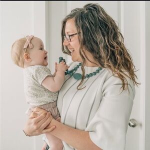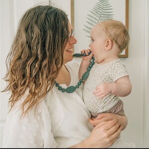 Chewbeads teething necklace featuring blue and green beads. Perfect for stylish moms and teething little ones.