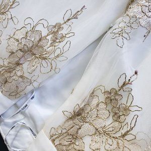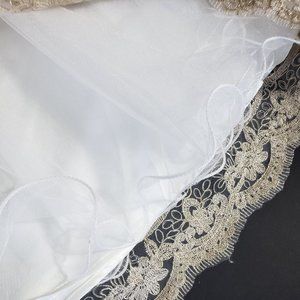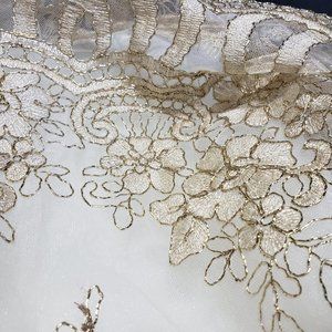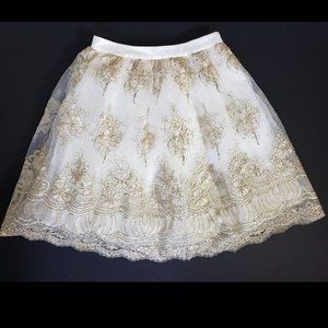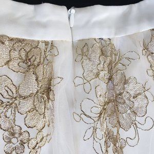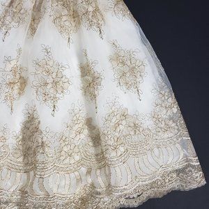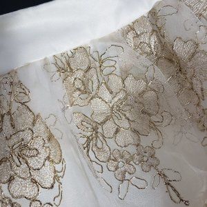 Gorgeous once in a lifetime tulle skirt in gold and cream. Waist 16”, length is 26.5”.