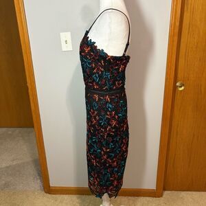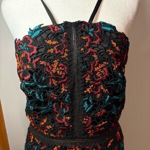 Colorful embroidery details the black lace overlay on this cocktail sheath, adding eye-catching vibrance to this halter-neck style.