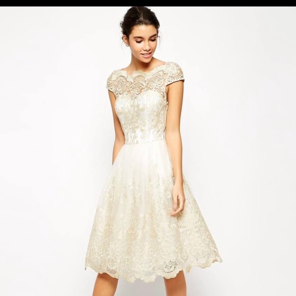 Chi Chi London Premium Lace dress. Perfect for winter formal or for a short wedding gown. The gold hints in the thread shine. The dress is gorgeous. I am a size 6. I order 8/10. Easier to take in if needed to. But I didn't need to. No smoking house. Stored in private closet.
