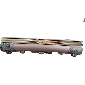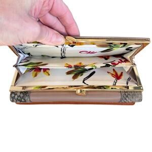 Vintage taupe beige leather handbag is Chi By Falchi. Front flap features extraordinary gray tiger eye-like cabochon gems on a gray reptile print leather setting. Gold metal shoulder strap. Magnetic closure on front flap, Interior is lined in a floral satiny fabric. Zipper side pocket and 2 smaller side pockets.