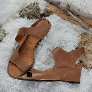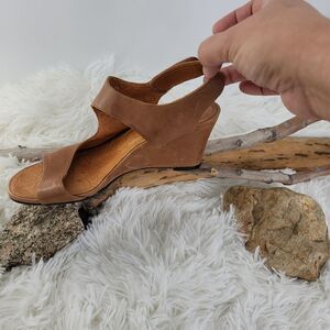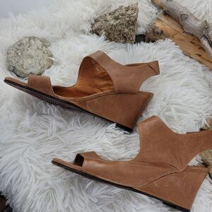 dorsay style peep toe leather wedge sandals. Preloved condition. All sections of interest as well any known flaws have been documented in the photos and noted as thoroughly as possible. However, if there are any questions feel free to ask. size is eu 37.5 which is us 7