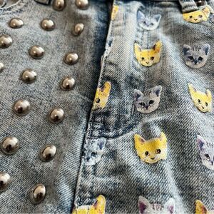 ChiQle Studded Cat Denim Cut Off Short Shorts, silver toned studs on one leg and printed cats on the other, sewn cut offs with small spot on the back of one leg. Otherwise excellent ore-owned condition.