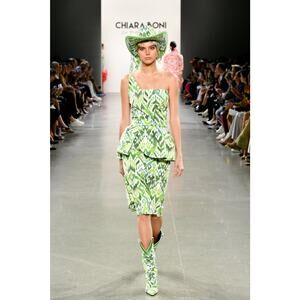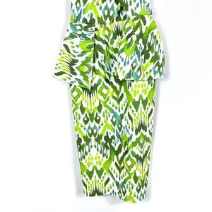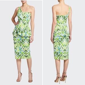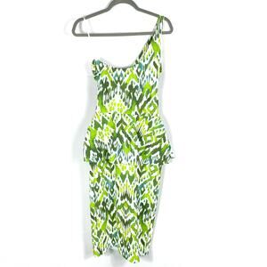 New Chiara Boni Chaz Print Sheath Dress Green White One Shoulder Peplum Sz 4