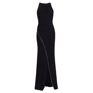 Made in Italy, the Liwen gown from Chiara Boni La Petite Robe has a fitted silhouette with flattering ruching at the waist. An embellished asymmetrical slit adorns the front of this style.