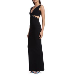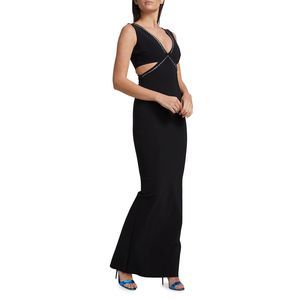 ONLY AT SAKS. This sophisticated fitted gown is cut with a sharp V-neck and timeless column silhouette, updated with edgy cut outs at the waist trimmed with crystal embellishments.