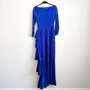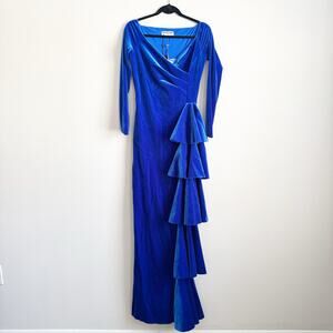 Made from rich velvet, this fitted gown features a wide V-neck and cascading ruffle detail at the side.