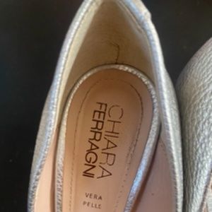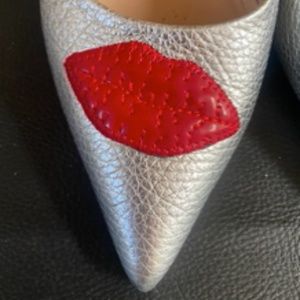 These silver leather Chiara Ferragni pumps were purchased new with tags from The RealReal in January, 2019. They are in great condition and are embellished with a red patent leather lip and a red, black, and gold lipstick on the top of the pointed-toes. Note that there is a slight scuff above the left heel, see last picture. They are looking for someone to love and adore them.