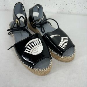 Chiara Ferragni Size 37 Winking Black & White Patent Leather 1.2 inch Platform Espadrilles. May not be original shoelaces besides that some wear on footbed and soles normal wear to body.