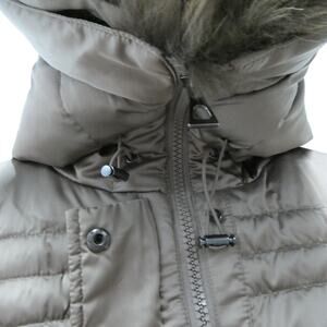Chiara and Sara women's small tan long puffy jacket removable fur on hood trim, Down Jacket parka real fur on hood trim