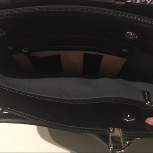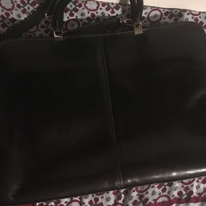 Leather briefcase with double handles and removable shoulder strap. Two compartments with magnetic button closure three zipped pockets two pen pockets and a cell phone pocket. Central compartment has a zip closure and a semi-rigid divider. Leather lining. Made in Italy. Closure: Zip. Handles/Strap: Double Leather handles. Hardware: Gold / silver metal Laptop: holds up to: max 15'' screen + iPad. Lining: Leather. Color: black Light marks "indents" Excellent Used Condition.
