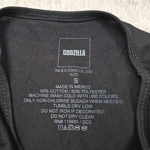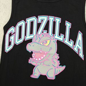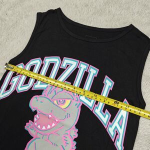 Chibi Godzilla graphic print tank top, material cotton blend, color black, women's size Small.