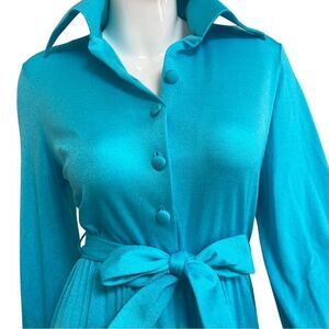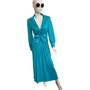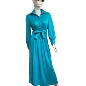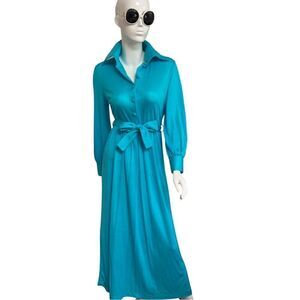 Chic 1970s Collared Button Up Tie Belted Maxi Dress with Cuffed Balloon Sleeves