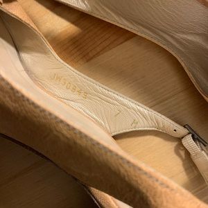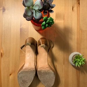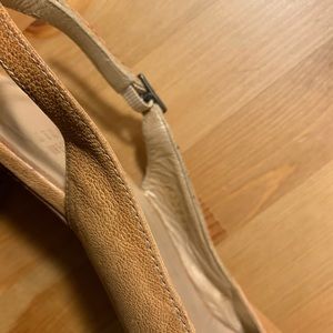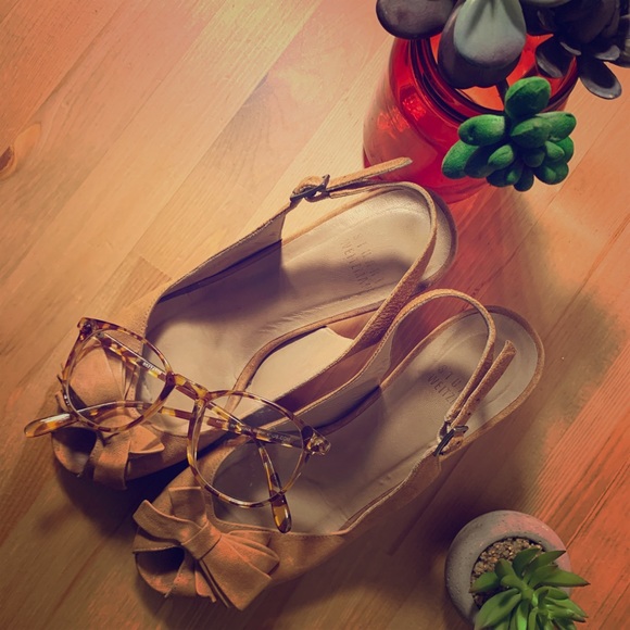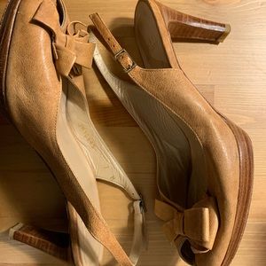 Tan opened toe shoes, with bow in front and adjustable strap.
