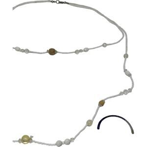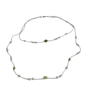 This stunning necklace features a multi-layered design with delicate white beads strung together in a contemporary, 90s-inspired style. The combination of the longer strand and shorter, chunkier strand creates a visually interesting and fashionable look that can elevate any outfit.