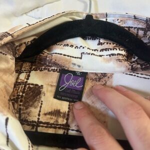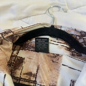 Elegant blouse with abstract patterns in brown and cream. Ideal for any occasion.