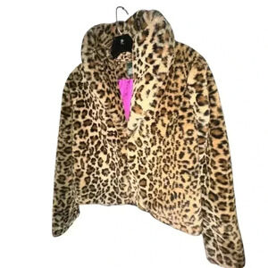 Make a bold statement with this stunning leopard print faux fur coat. The vibrant pattern and cozy material make it a standout piece for any wardrobe. It has a classic collar and an open front, perfect for layering over casual or dressy outfits. The coat is fully lined with a black interior for added warmth.