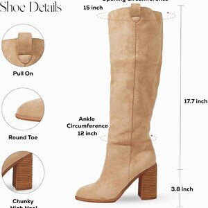 Features: These stunning knee-high boots feature a sleek polyurethane outer material with a fashionable apricot hue. The zip closure makes them easy to slip on and off. They have a 3.8-inch heel, a 14.7-inch shaft height, and a comfy, non-slip rubber sole perfect for all-season wear.