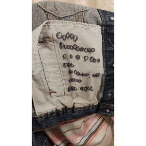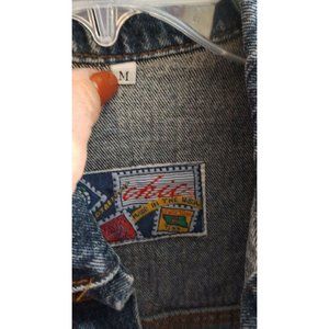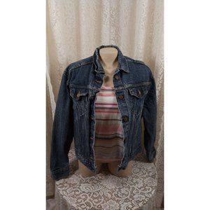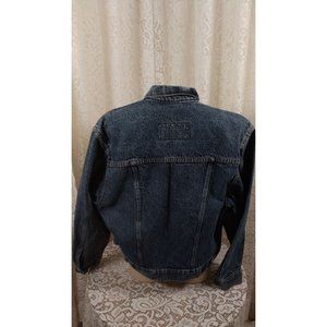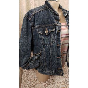 Cute denim jacket, waist length. Long sleeves with buttons at cuffs and at waist band. Button front with 4 outer pockets. There is illegible writing on the inner lining of one of the pockets (see pics!).