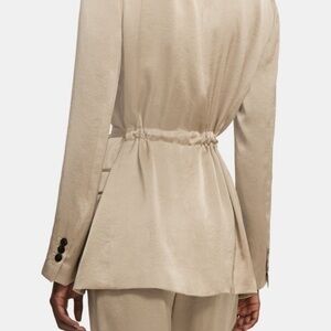 Elegant double-breasted blazer with a tie belt. Features two front pockets and button details.