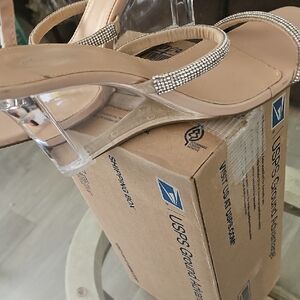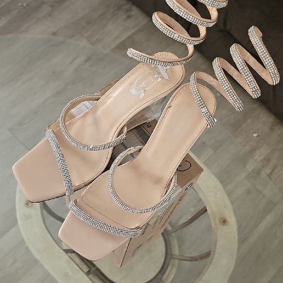 Elevate your look with these chic beige heels adorned with sparkling rhinestones. Perfect for adding a touch of glamour to any outfit.