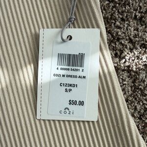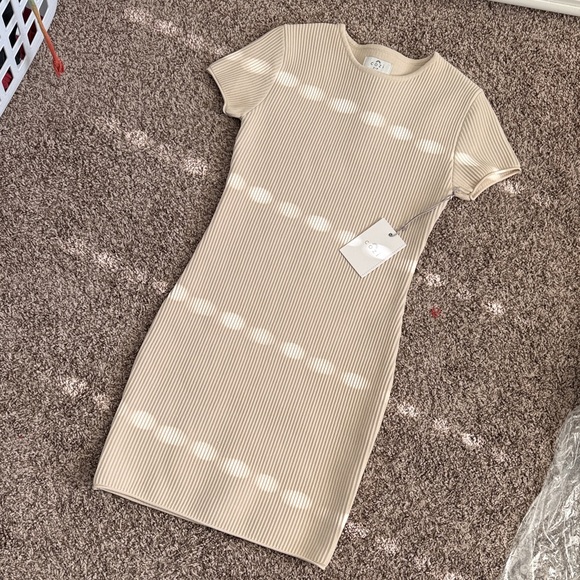 Elevate your wardrobe with this chic beige ribbed mini dress. Its sleek design and comfortable fit make it a versatile choice for any occasion.