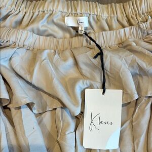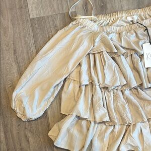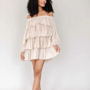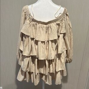 Stylish off-shoulder boutique dress with layered ruffles. Perfect for a trendy look. Beige color. Never worn with tags. Too short for a dress on me (I’m 5’7 for reference) & too large in size to be a top. Boutique styled picture posted for fit reference.