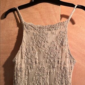 Elevate your style with this chic beige maxi dress. Its textured design adds a touch of sophistication, perfect for any occasion. The tag says Large but I wore it when I was a size 0 and it was skin tight.