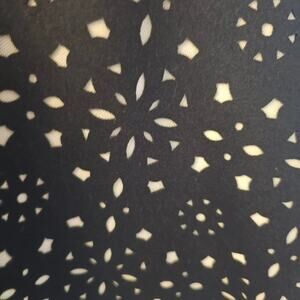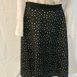 This stylish black A-line skirt features a unique geometric cutout pattern that reveals a subtle contrasting white layer underneath, giving it a modern and sophisticated touch. The knee-length design offers both elegance and practicality, while the addition of discreet pockets enhances functionality without compromising style. Perfect for both casual and professional settings, this skirt pairs effortlessly with a variety of tops for a polished, contemporary look.