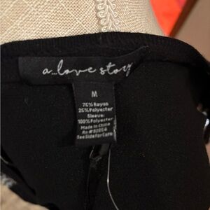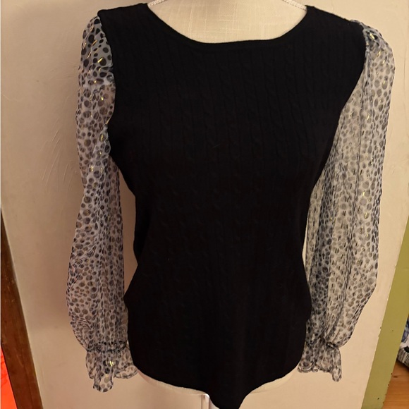 Elevate your style with this chic black blouse featuring elegant patterned sheer sleeves. Perfect for any occasion, this top adds a touch of sophistication to your wardrobe.