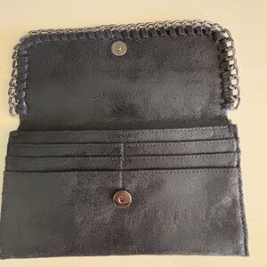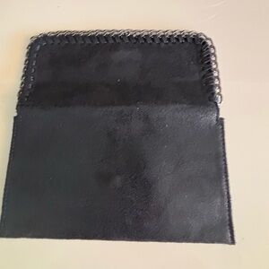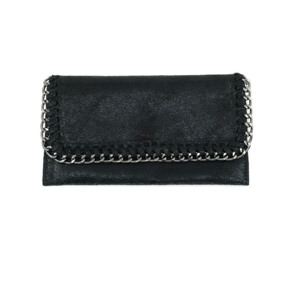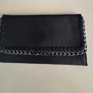 Stylish black clutch featuring a bold chain embellishment. Very thin wallet that can be carried as a little Clutch Ideal for elevating any outfit.