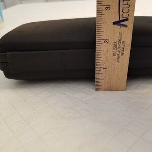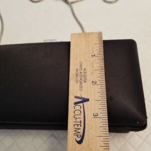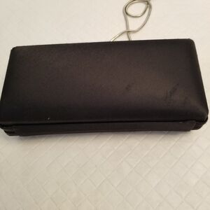 Elegant black clutch with a sleek design. Features a stylish silver chain for easy carrying. Perfect for evening events.Bechamel Black Clutch Hard Case 7 X 3 X 2 .Silver Handle. See Photos Flaw one Corner
