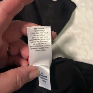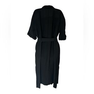 Stylish black shirt dress with a tie waist. Features rolled-up sleeves and a classic collar.