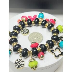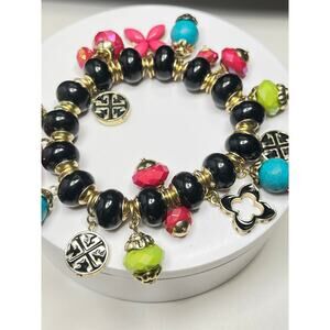 This striking charm bracelet is a perfect addition to any jewelry collection, offering a blend of modern elegance and timeless style. The bracelet features a bold design with a double strand of polished black beads, accented with radiant gold-toned spacers. The piece is adorned with a variety of unique and eye-catching charms, each adding a touch of personality and sophistication.