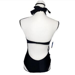 Make a statement with this chic black halter one-piece swimsuit. Ideal for a stylish beach day.
