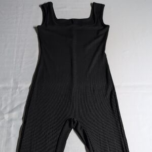 This black jumpsuit offers a sleek and streamlined silhouette, crafted from a stretchy material for ultimate comfort. Perfect for both casual outings and more formal occasions, it combines style with functionality. The full-length design ensures a flattering fit from top to bottom.